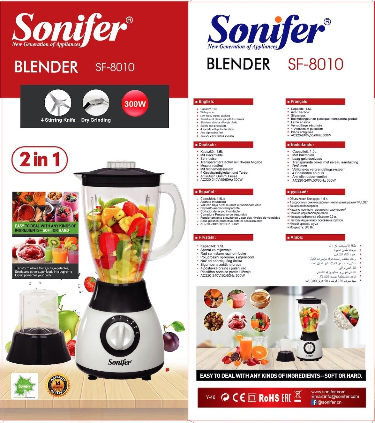 خلاط 300وات SF-8010 Blender 300 W . محضر الطعام والفواكه والخضروات وعاء زجاجي سعة 1.5 لتر . موفر للطاقة. سهل الفك والتظيف قطع من الشفرات المصنوعة من الستانلس ستيل ضمان سنه