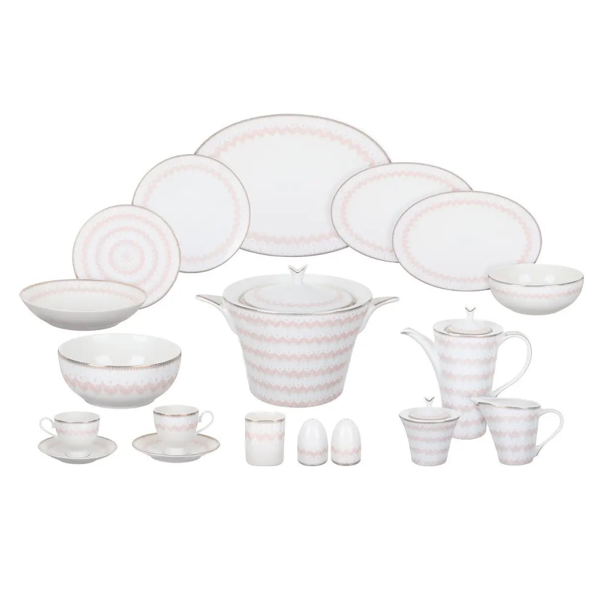عدد القطع: 62 6 اطباق عشاء 6 اطباق عميقة 6 اطباق كيك 6 بولات 6 اكواب شاي 6 اطباق شاي 6 اكواب قهوة 6 اطباق قهوة براد شاي بالغطاء سكرية بالغطاء كريمر سلطانية شوربة بالغطاء بولة سلطة 3 اطباق تقديم ملاحة وفلفل قطعة بورسلين لتخزين اعواد الاسنان الخشبية اسم الموديل: فيوليت كورايا