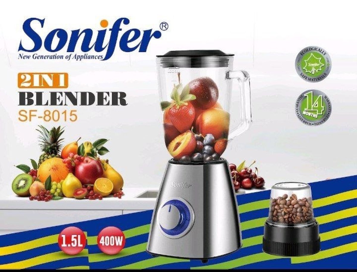 خلاط 1×2 ماركه Sonifer موديل(SF-8015) سعه لتر ونصف خلاط ومطحنه، سهل الفك والتنظيف، 8قطع من الشفرات المصنوعة من الاستانلس 400وات 🤍