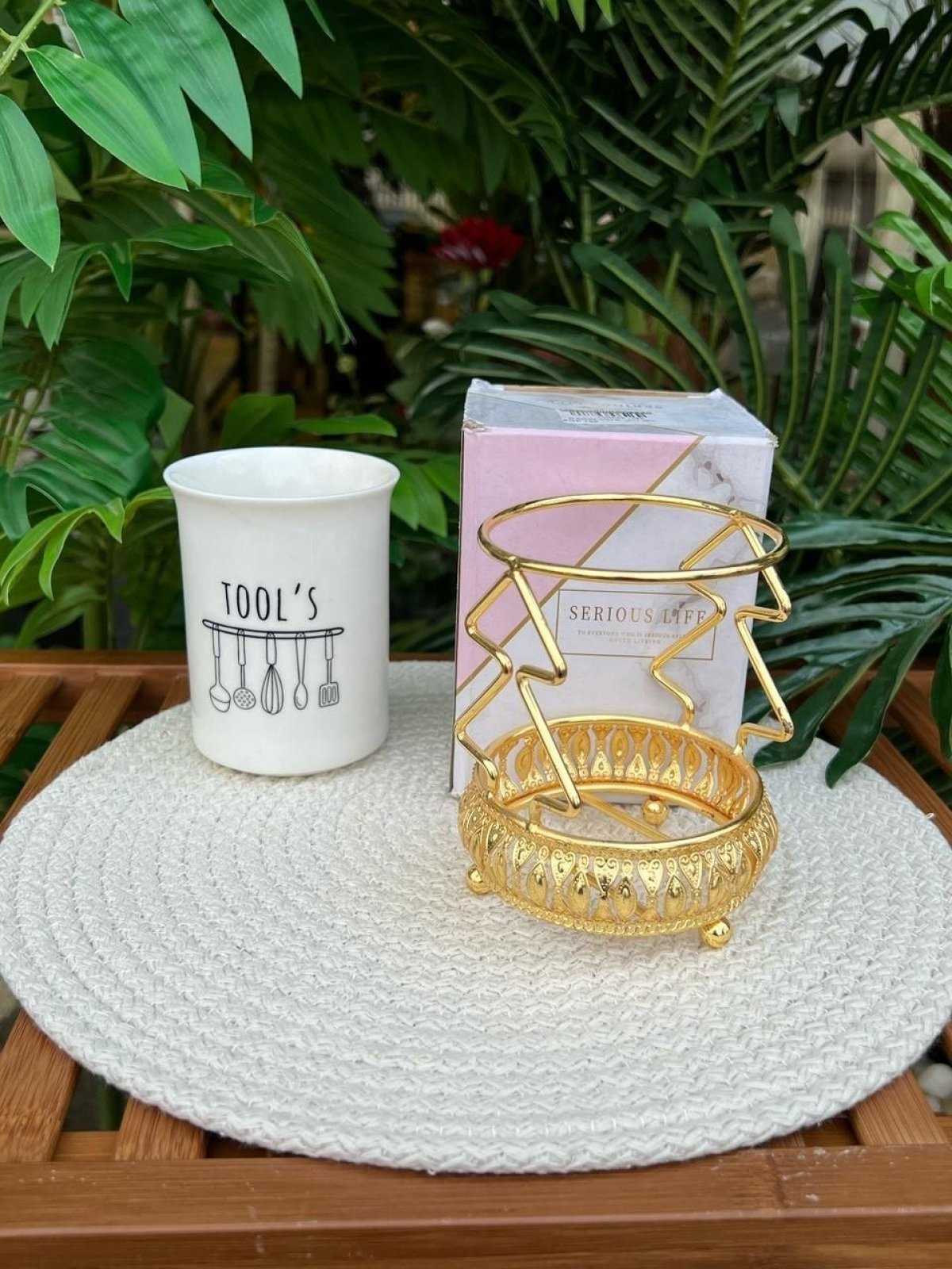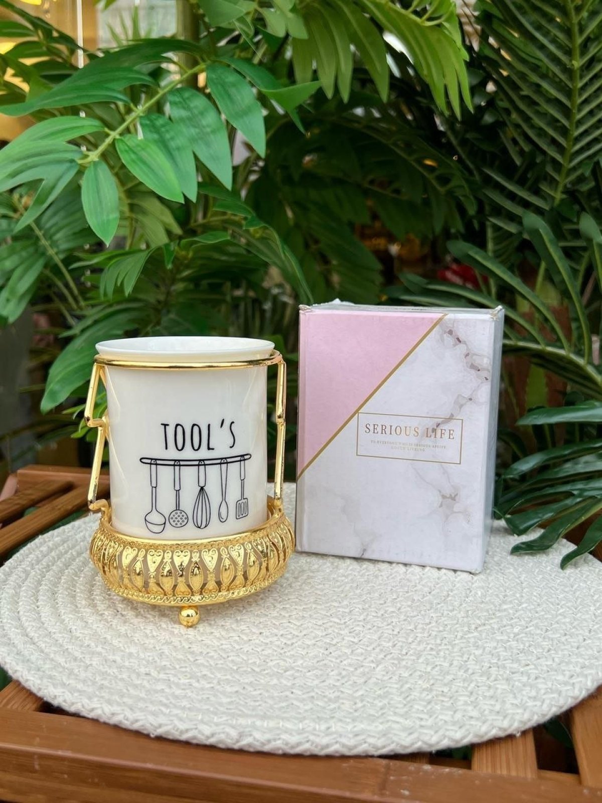خامة بورسلين عالية الجودة - تصميم أنيق وفخم بالستاند الذهبي - مثالي لتنظيم المعالق والشوك - يضيف لمسة ديكور جميلة لبيتك