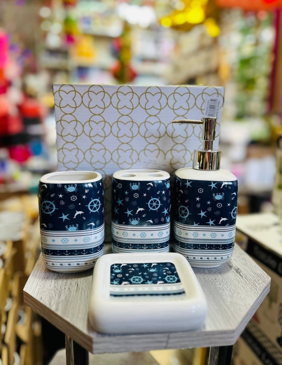 طقم حمام 4 قطع بورسلين - يتكون من: ديسبنسور غسول يد + 2 قطعة لتنظيم الفرش + صبانه - خامة بورسلين عالية الجودة ومتينة - تصميم شيك وأنيق يناسب كل الحمامات - سهل الاستخدام وسهل التنظيف