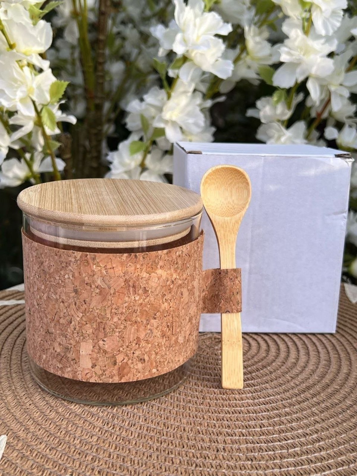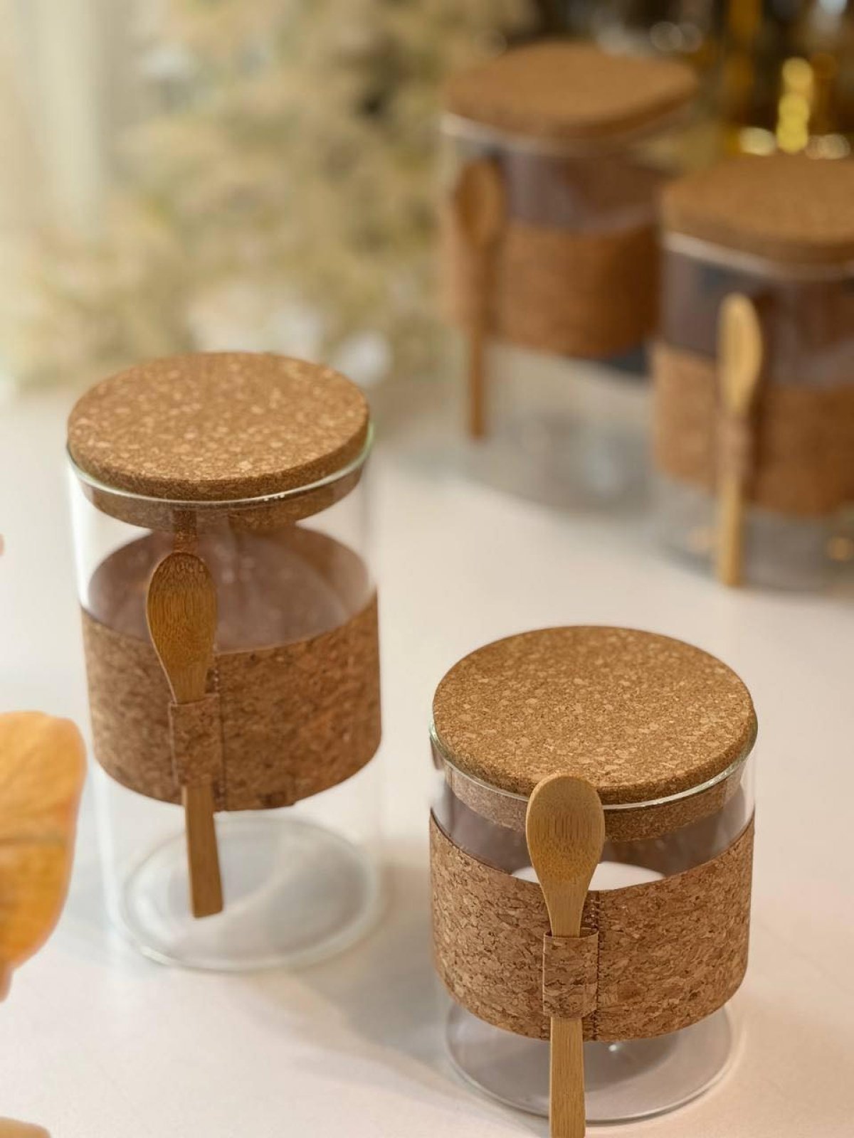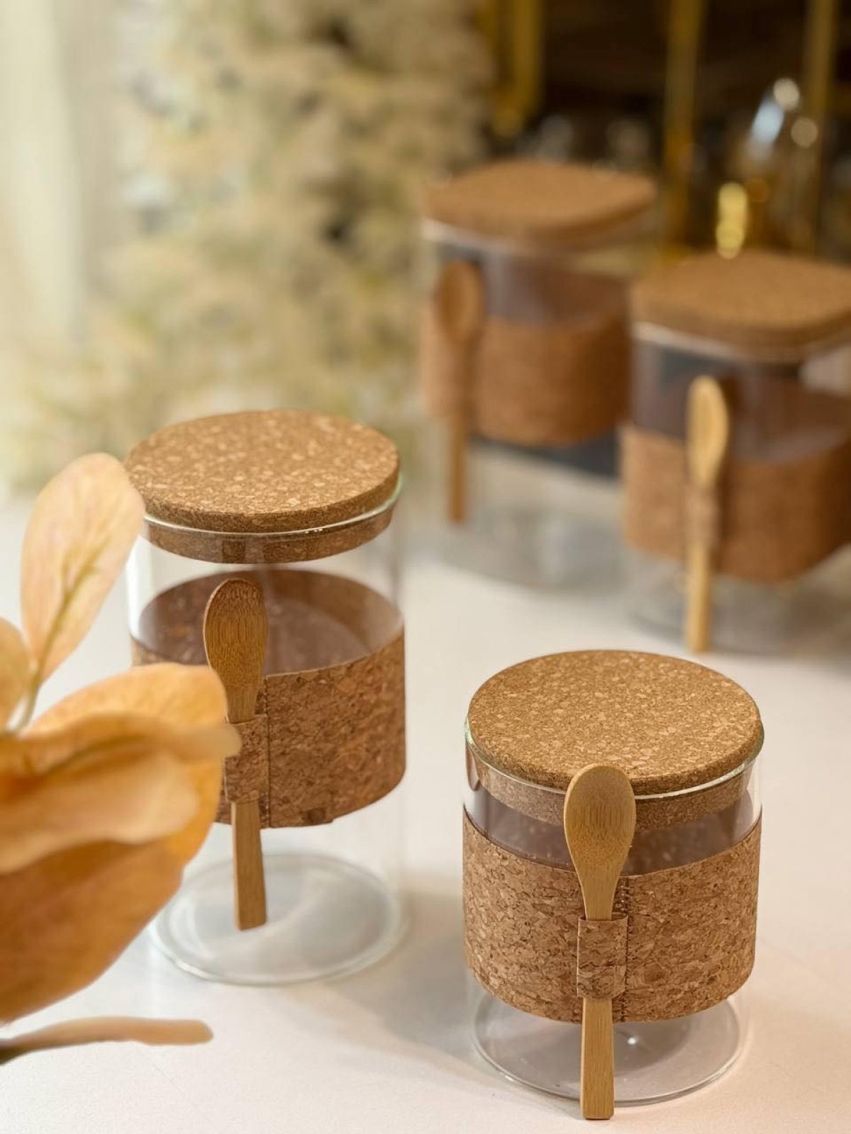 برطمان زجاج بوروسيليكات بغطاء خشب بامبو مزود بجوان لحكم الغلق ومنع التسريب+معلقه خشب . مقاس19×10سم