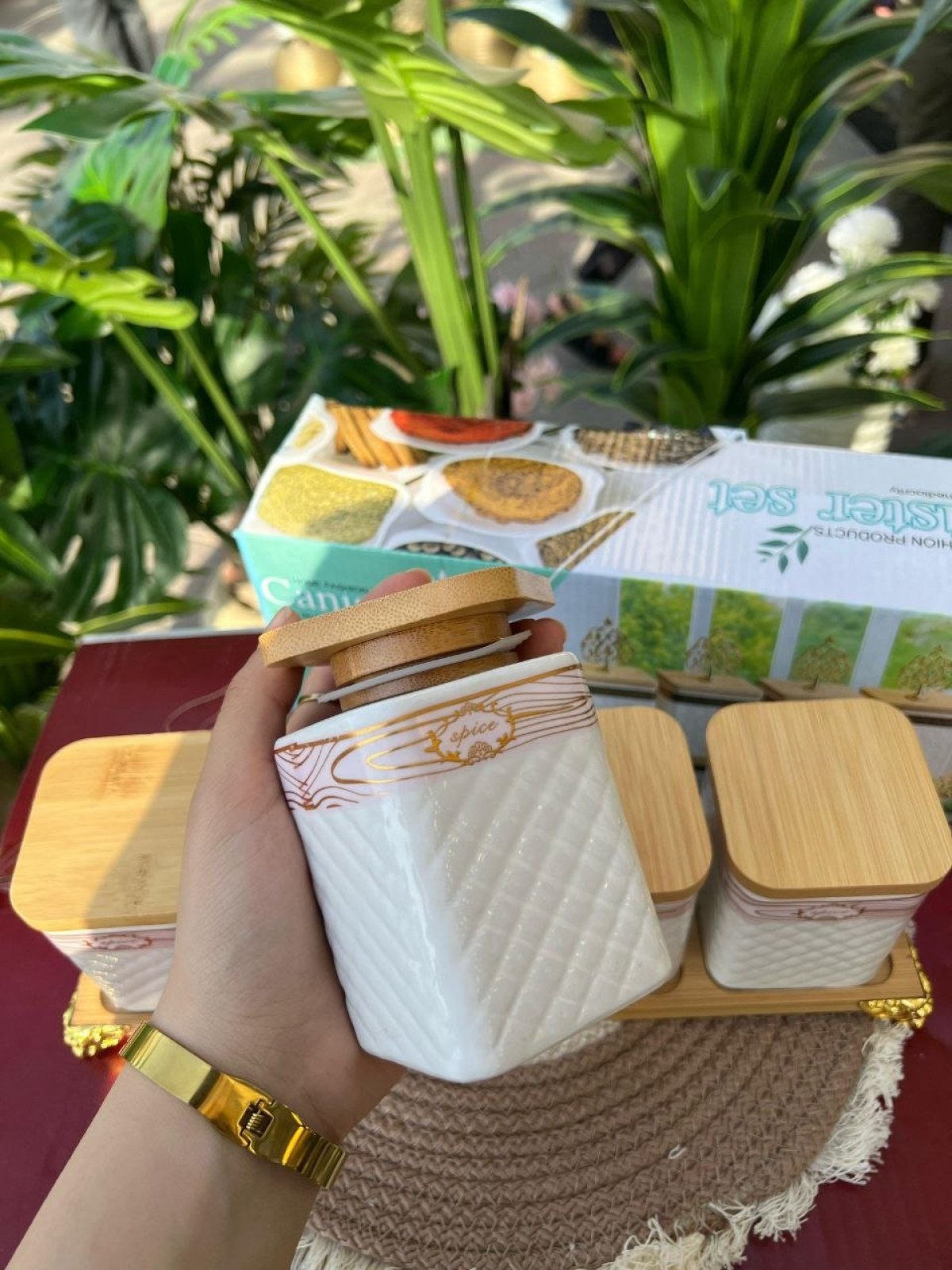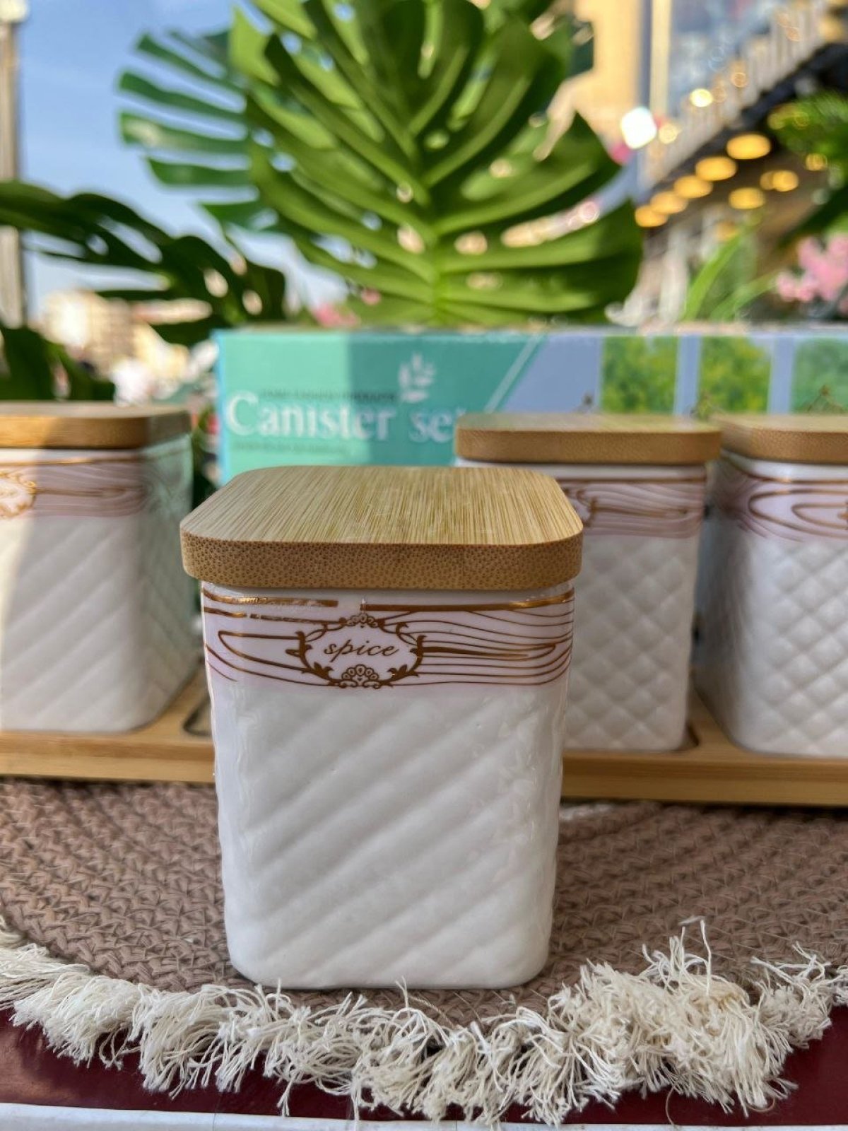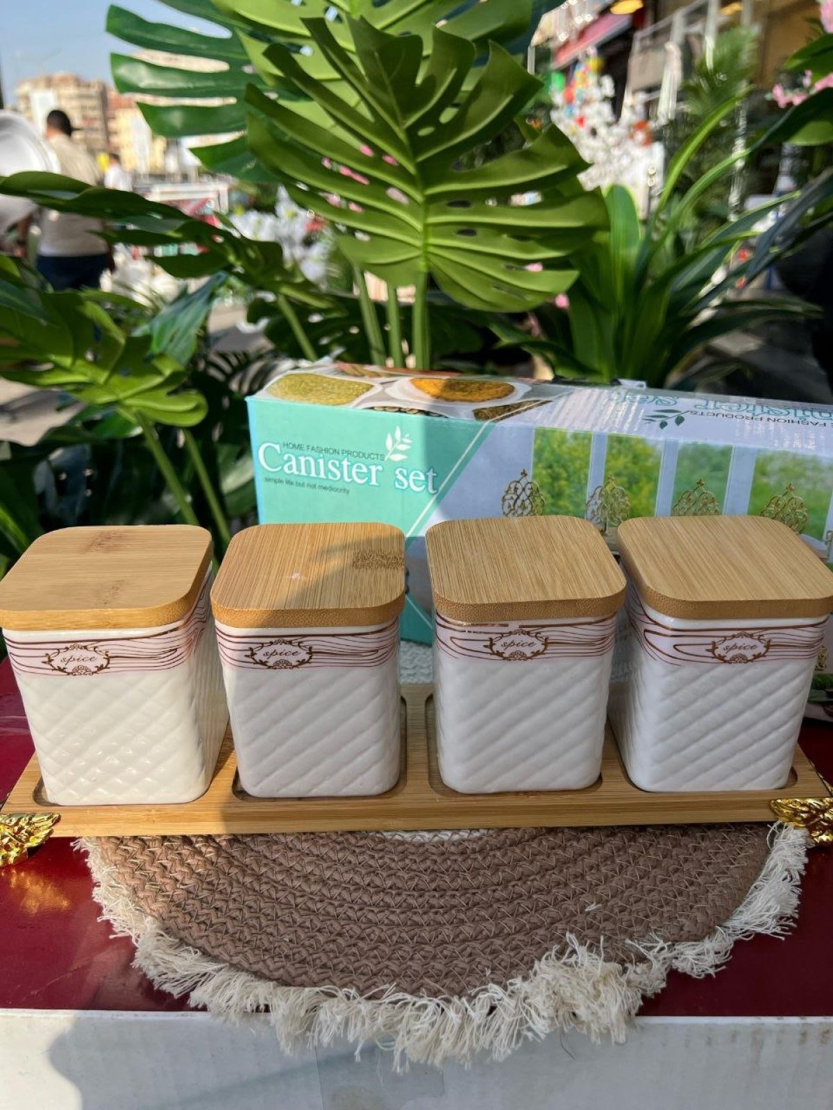 طقم توابل مكون من 4قطع ، الخامه بورسلين، بغطاء وحامل خشب بامبو 🤍 طقم مهم للتوابل الاساسيه في مطبخك أو للشاي والسكر والقهوه للكوفي كورنر متريال عاليه جدًا وعملي وشيك🤍