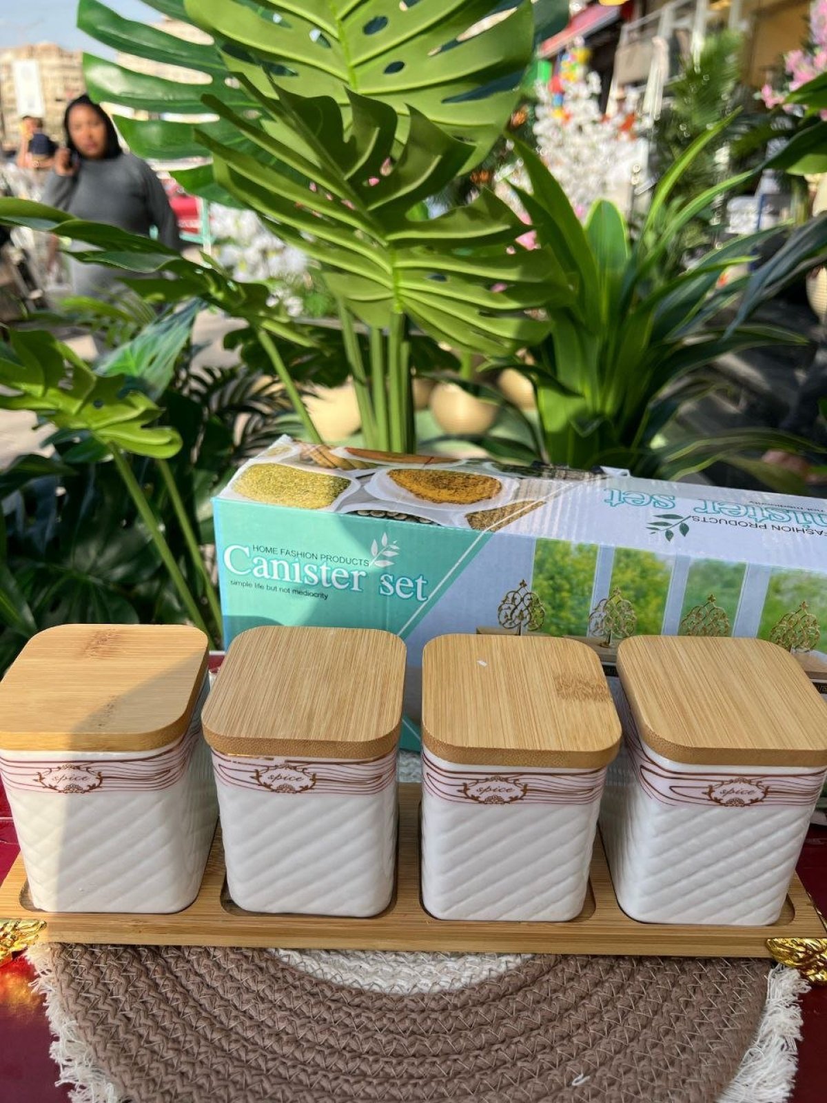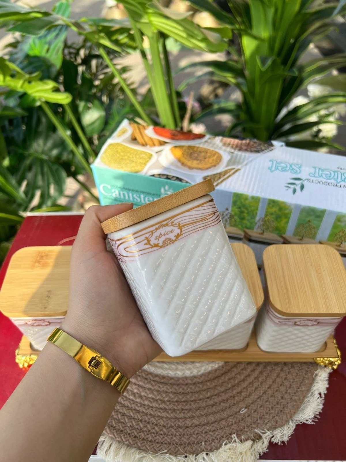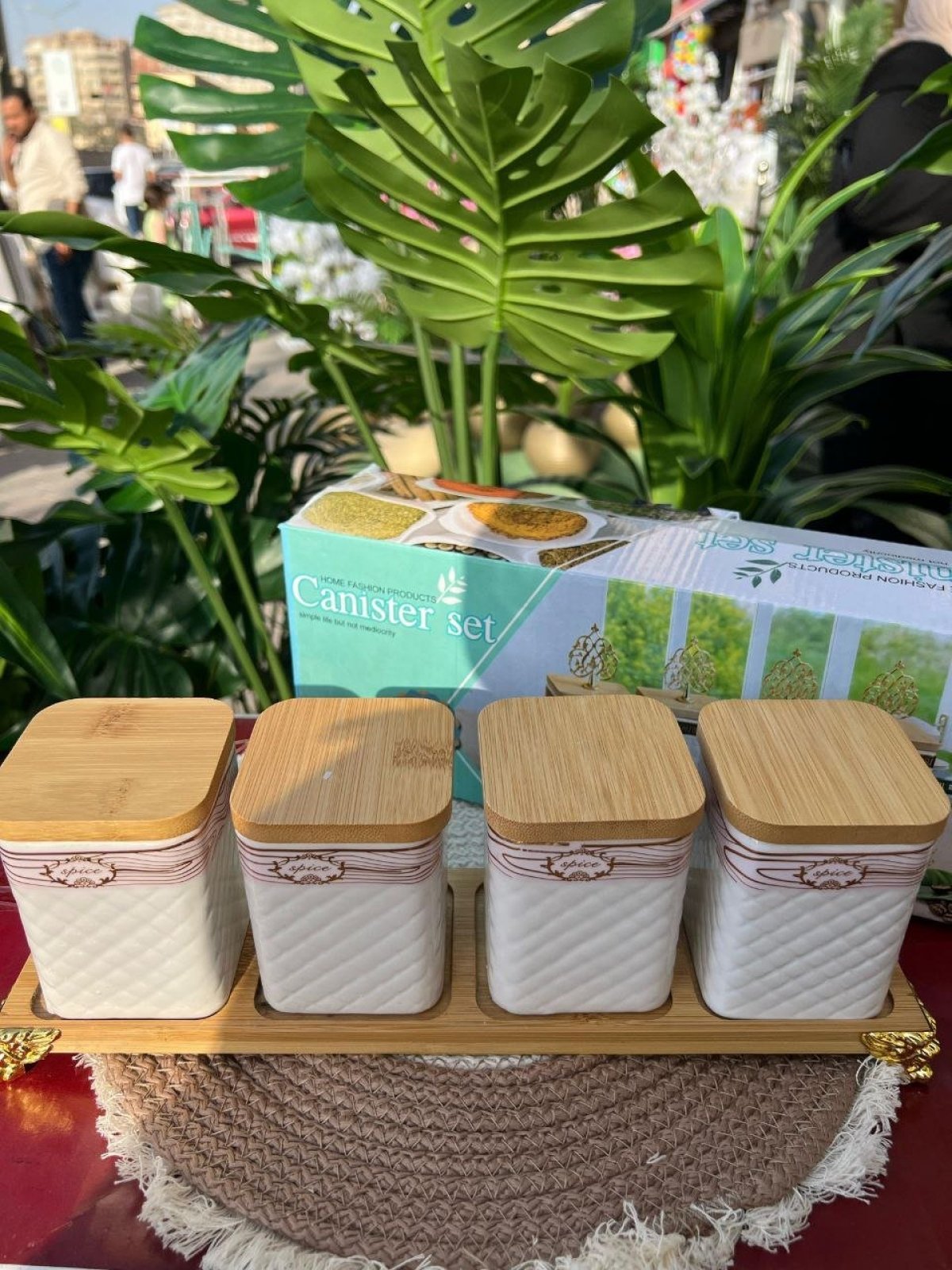 طقم توابل مكون من 4قطع ، الخامه بورسلين، بغطاء وحامل خشب بامبو 🤍 طقم مهم للتوابل الاساسيه في مطبخك أو للشاي والسكر والقهوه للكوفي كورنر متريال عاليه جدًا وعملي وشيك🤍