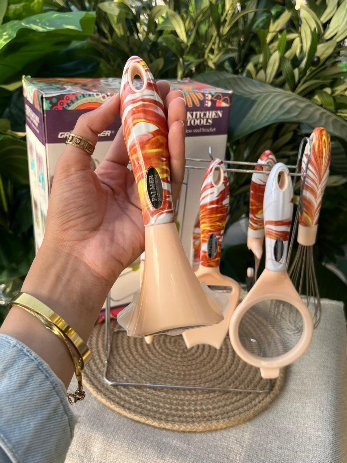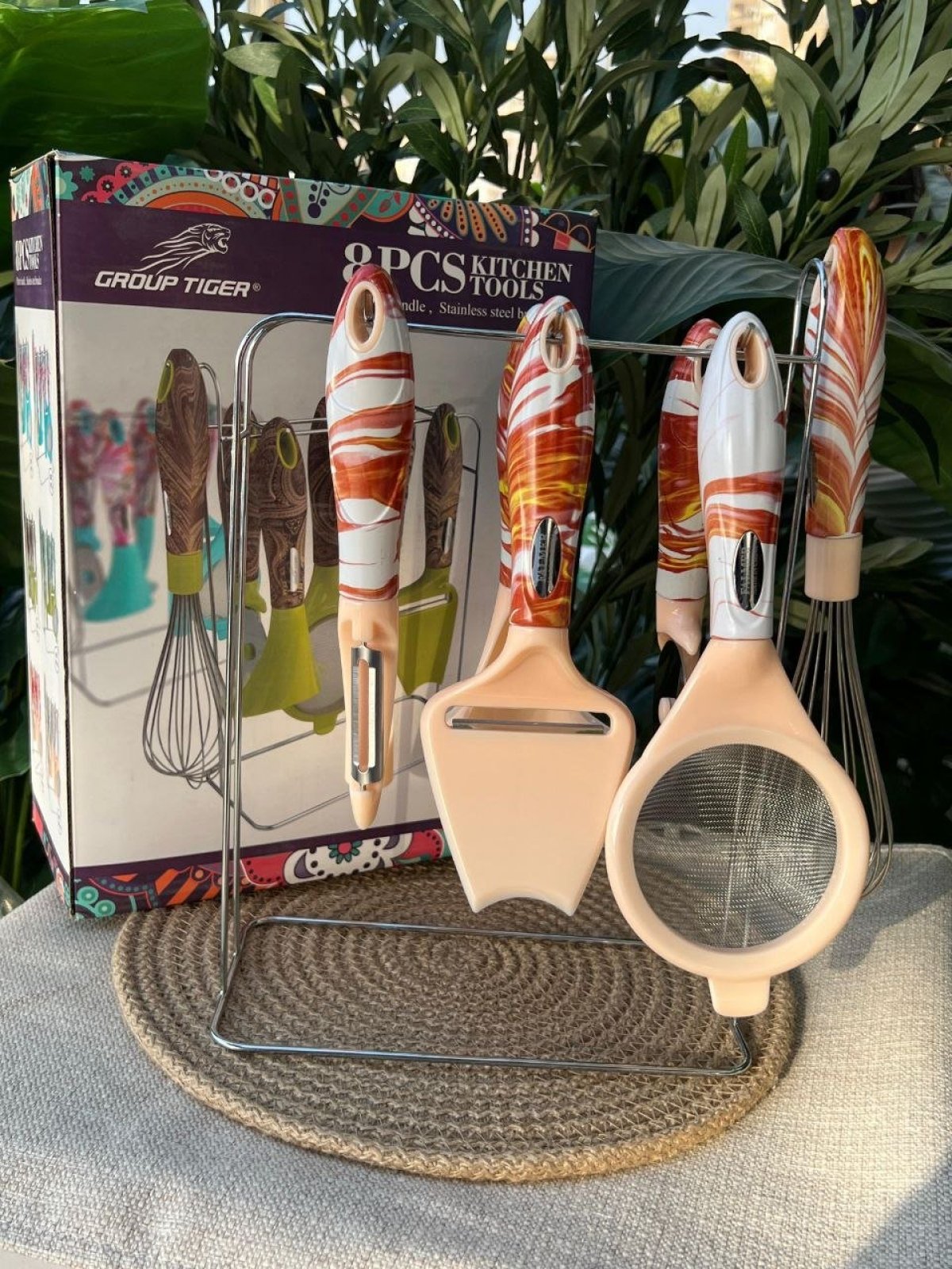 طقم توزيع متكامل 8 قطع يحتوي على: - مضرب - مصفاة - مبشرة - قطاعة بيتزا - 2 أدوات إضافية عملية - استاند معدني أنيق للتنظيم كل الرفايع الصغيره ف طقم واحد