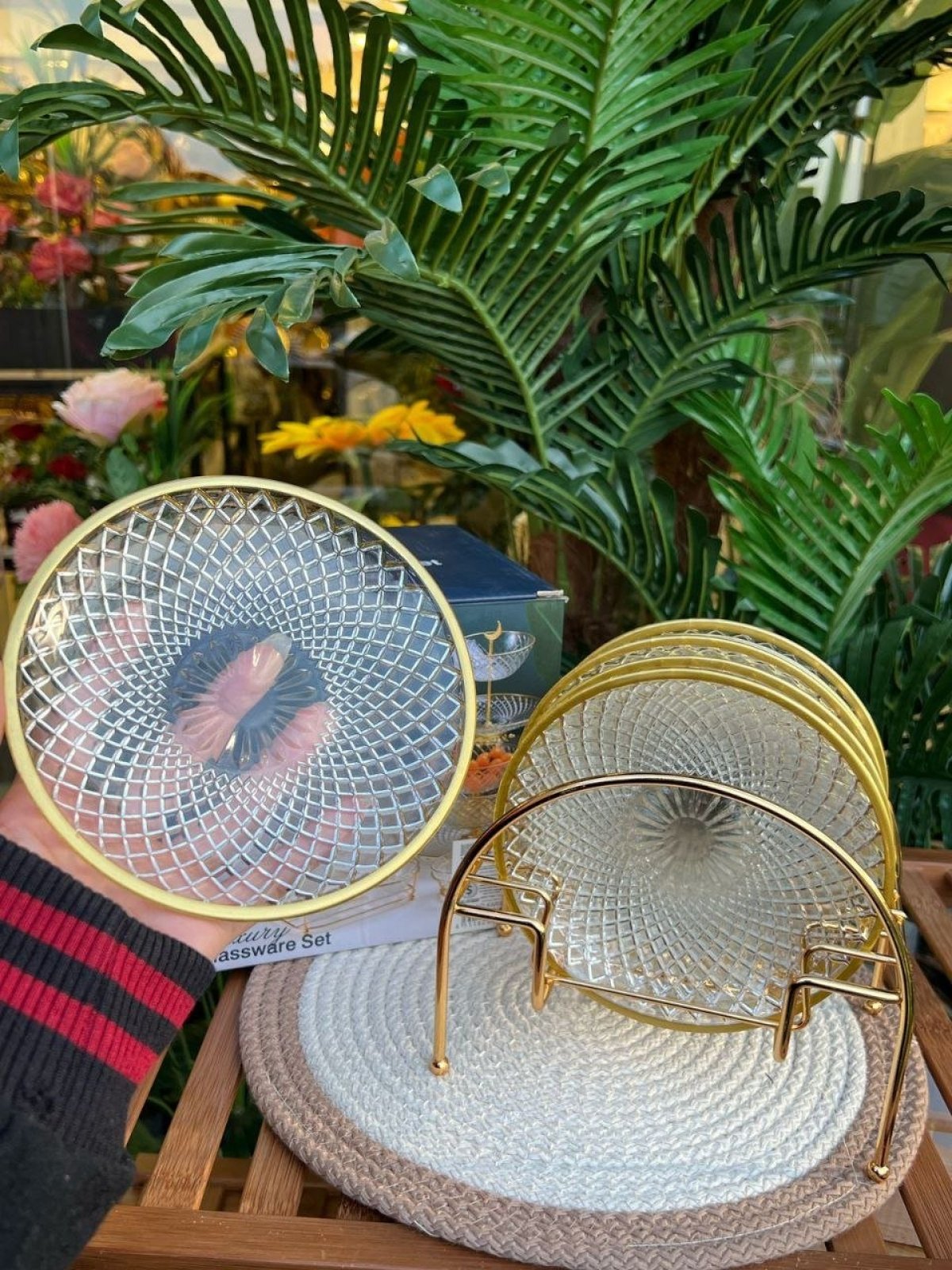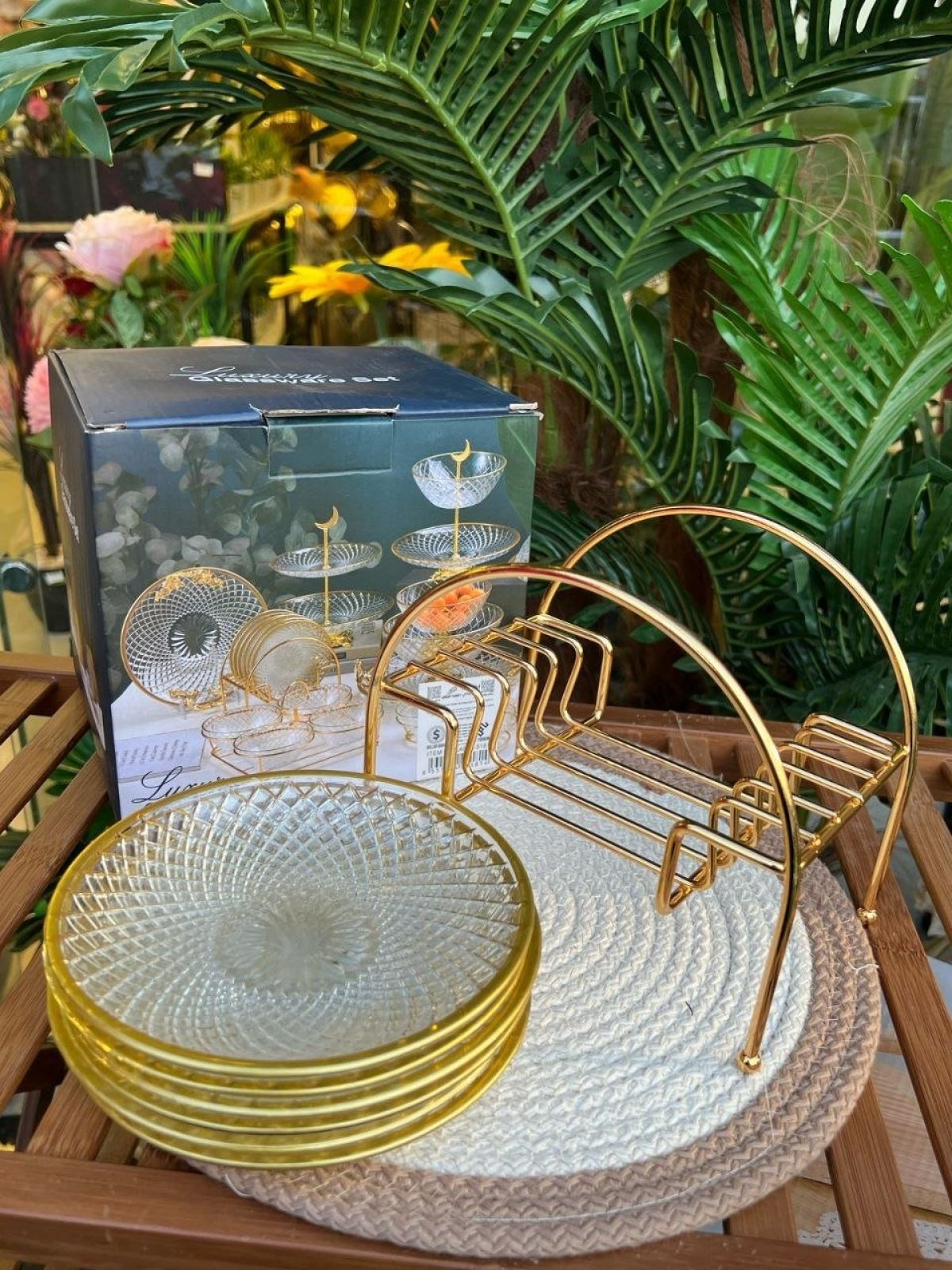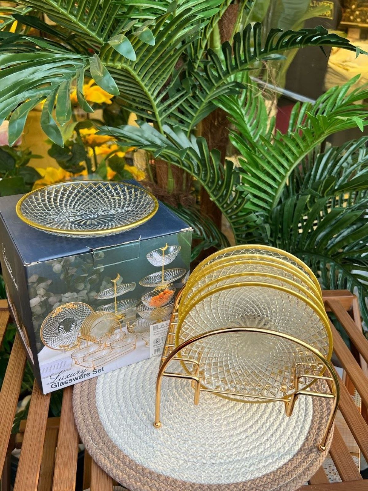 الطقم مكوّن من6 اطباق زجاج مع استاند معدن مطلي باللون الجولد لتقديم الجاتوه والحلويات بشكل جذاب🤍✨